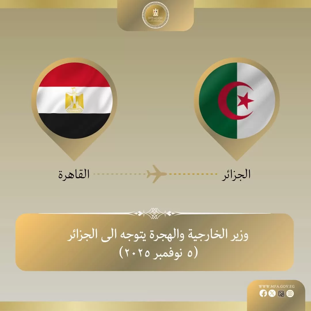 Le ministre des Affaires étrangères, de l’Immigration et des Affaires des Égyptiens à l’étranger, M. Abdel Aati, s’est rendu aujourd’hui, mercredi 5 novembre 2025, à Alger, où il doit tenir des entretiens avec plusieurs hauts responsables du gouvernement algérien afin d’examiner les moyens de renforcer les relations bilatérales entre les deux pays frères, ainsi que d’échanger les points de vue sur les questions régionales d’intérêt commun.