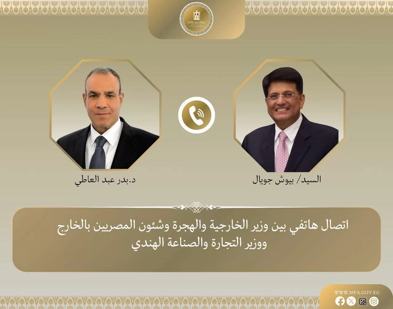 Lors de sa visite à New Delhi, le ministre des Affaires étrangères, Badr Abdel-Aati, a eu un entretien téléphonique avec M. Piyush Goyal, ministre indien du Commerce et de l’Industrie.