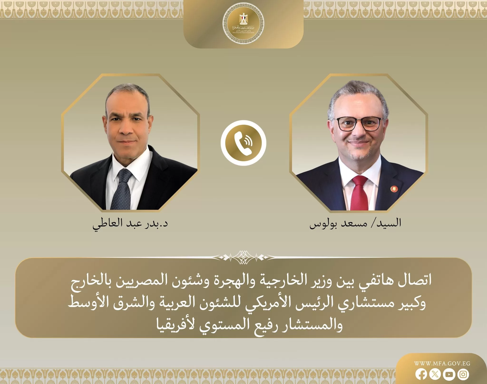 Le ministre des Affaires étrangères, Dr Badr Abdel Aati, a reçu aujourd’hui dimanche, un appel téléphonique de M. Massad Boulos, haut conseiller du président américain pour les affaires arabes, le Moyen-Orient et l’Afrique.