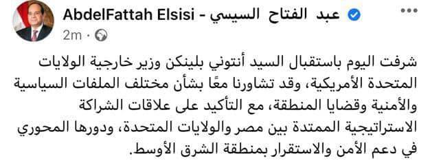 Le Président Abdel Fattah Al-Sissi s’est félicité, sur son compte Facebook, d’avoir reçu, aujourd’hui, le Secrétaire d’Etat américain, Antony Blinken, soulignant avoir examiné avec le ministre américain, de nombreux dossiers politiques et sécuritaires et avoir discuté des causes régionales.