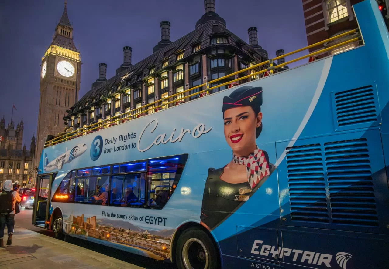 La compagnie EgyptAir a lancé une campagne marketing sur les bus de la capitale du Royaume-Uni, Londres, pour annoncer ses vols. Elle propose trois vols quotidiens vers l’aéroport international du Caire, dans le cadre de son engagement à soutenir et à dynamiser le secteur du tourisme entre l’Egypte et le reste du monde, en offrant le meilleur service à un maximum de voyageurs, leur permettant ainsi de profiter d’une expérience de voyage exceptionnelle à bord des vols EgyptAir.