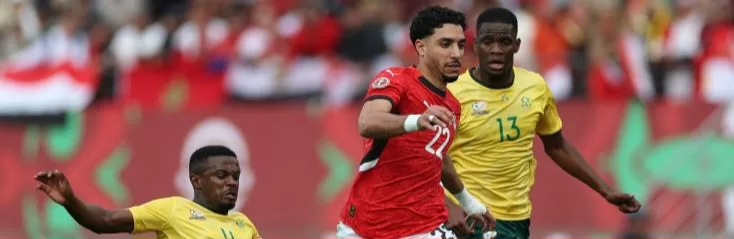 - Le défenseur sud-africain Khuliso Mudau porte sa main au visage de l’attaquant égyptien Mohamed Salah, lors d’un match de la CAN-2025, le 26 décembre 2025 à Agadir (Maroc) AFP FRANCK FIFE