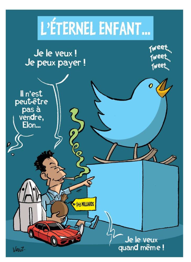 Dessin par Vadot paru dans L’Echo, le 15 avril 2022 qui parle du multimilliardaire Elon Musk propose de racheter Twitter “à 100 %”, selon une notification adressée aux autorités boursières américaines. Il se dit prêt à débourser 54,20 dollars par action Twitter, soit une prime de 38% par rapport à la veille de l’annonce publique de son investissement dans la plateforme. Après cette annonce, Twitter a fait savoir qu’elle allait “examiner avec attention” cette offre. Jeudi matin, son action bondissait de 11,34 %, à 51,05 dollars, dans les échanges électroniques précédant l’ouverture de Wall Street.