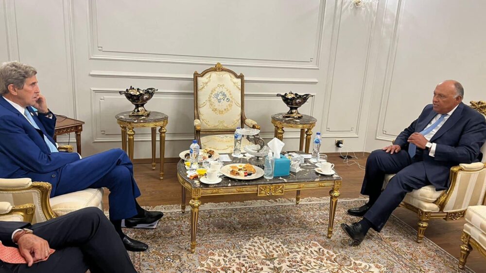Le ministre des Affaires étrangères, Sameh Choucri, président désigné de la COP27, a discuté, mercredi, avec l’envoyé spécial du président américain pour le climat John Kerry, des aspects de la consultation en cours et de la coordination entre l’Égypte et les États-Unis dans le domaine du changement climatique.