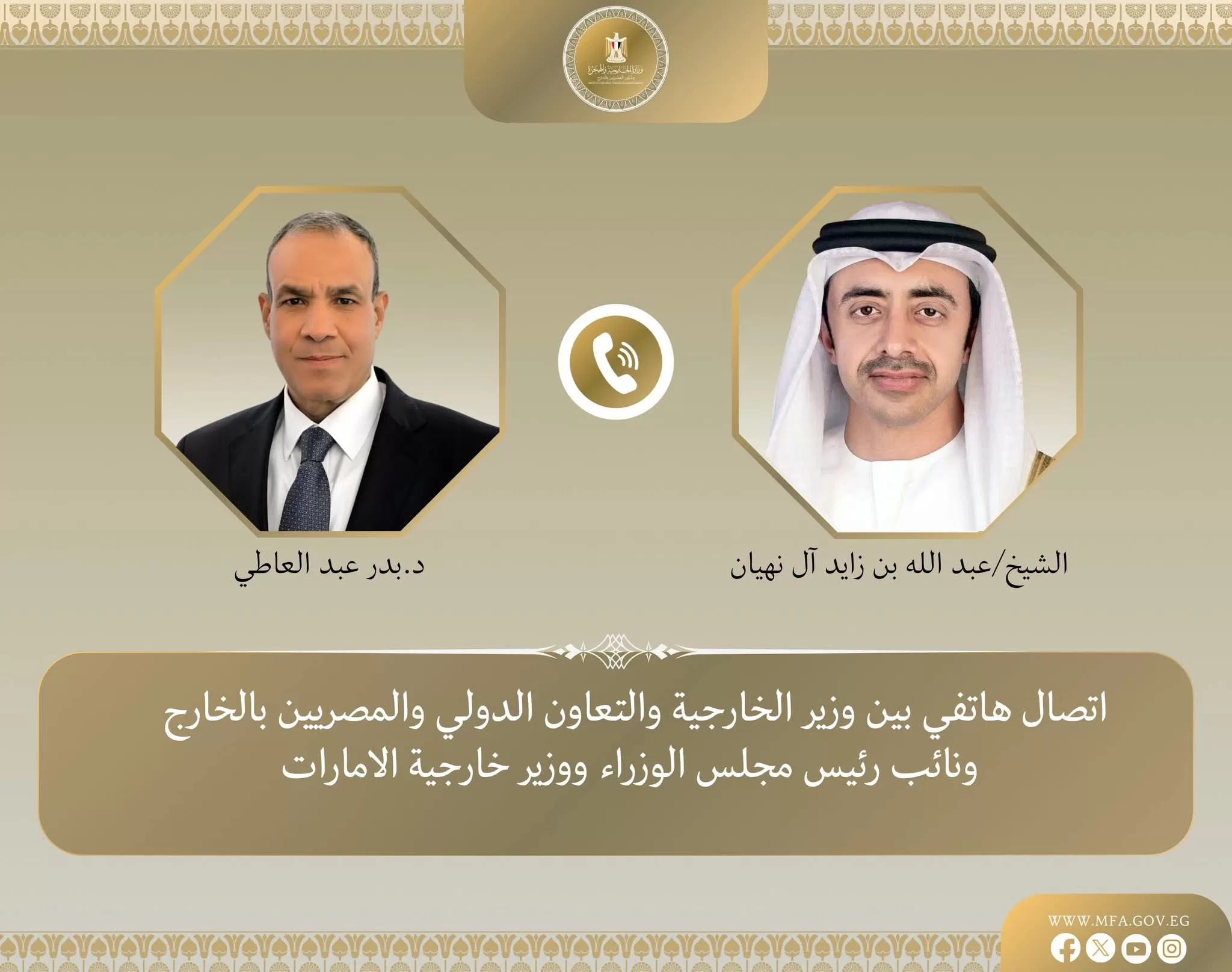 Un entretien téléphonique a eu lieu entre le ministre des Affaires étrangères, de la Coopération internationale et des Égyptiens à l’étranger, Dr Badr Abdel-Aati et Son Altesse le cheikh Abdallah ben Zayed Al Nahyane, vice-Premier ministre et ministre des Affaires étrangères des Émirats arabes unis, dans le cadre des consultations et de la coordination continues entre les deux pays frères.