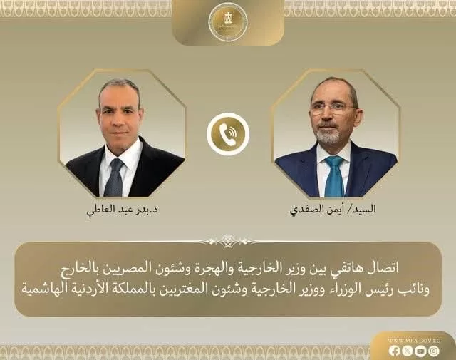 Un entretien téléphonique a eu lieu entre le ministre des Affaires étrangères, de l’Immigration et des Égyptiens à l’étranger,Dr Badr Abdel-Aati, et le Vice-Premier ministre et ministre des Affaires étrangères et des Expatriés du Royaume hachémite de Jordanie, M. Ayman Safadi, afin d’examiner les moyens de renforcer les relations bilatérales et d’échanger sur l’évolution de la situation dans la région, dans le cadre de la coordination et de la concertation continues entre les deux pays frères.