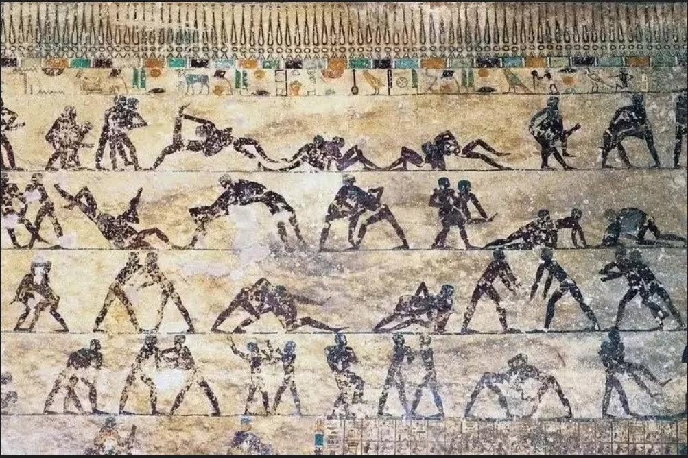 Pâtir des pyramides, creuser des tombeaux, faire la guerre n’a jamais empêché les Egyptiens de trouver du temps pour faire du sport. La plus ancienne représentation d’une scène sportive figure sur la palette du tribut libyen, datant de 5 300 ans. On y voit deux hommes en train de lutter l’un contre l’autre. La lutte est certainement l’activité sportive préférée des Egyptiens. Témoin, les sépultures taillées dans la roche de Beni Hassan datant de 4 000 ans. Leurs résidents étaient des prêtres, des nobles et des fonctionnaires. Les murs sont couverts de scènes quotidiennes. Ainsi sept tombes contiennent des scènes de lutte et plus particulièrement deux d’entre elles où sont représentés 400 couples de lutteurs nus. Chacun engagé dans une prise différente. Apparemment, le combat cesse quand l’un des lutteurs tombe à terre. Commune à de nombreuses civilisations, la lutte pourrait bien être le premier sport pratiqué par l’homme. « Le sport en Egypte semble avoir été lié de très près à la guerre, » conclut l’historien Jean-Paul Thuillier. « Il constitue, pour les soldats professionnels, un entraînement physique nécessaire. » Contrairement à la Grèce, les sportifs égyptiens appartiennent à toutes les classes sociales.