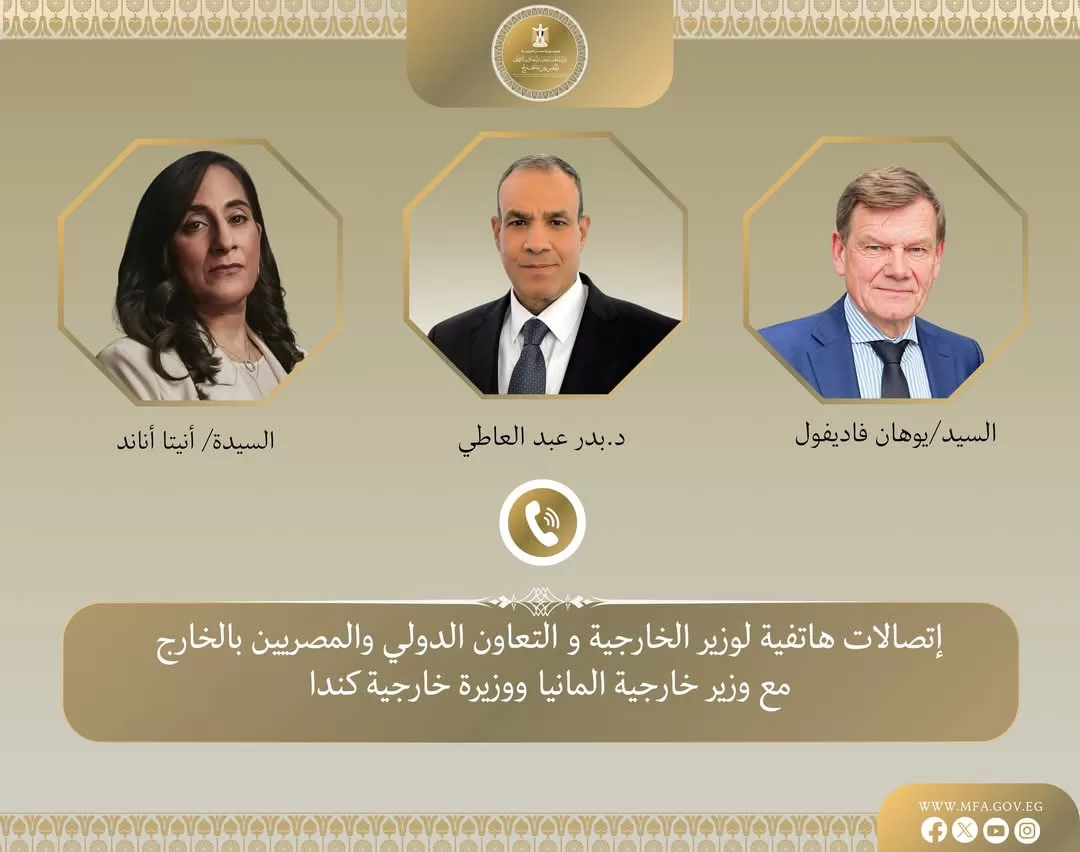 Le ministère des Affaires étrangères, de la Coopération internationale et des Égyptiens à l’étranger a annoncé que le Dr Badr Abdel-Aati, ministre des Affaires étrangères, a eu deux appels téléphoniques lundi 6 avril avec M. Johan Wadephul, ministre des Affaires étrangères d’Allemagne, et Mme Anita Anand, ministre des Affaires étrangères du Canada, pour discuter des évolutions régionales et des efforts de désescalade.