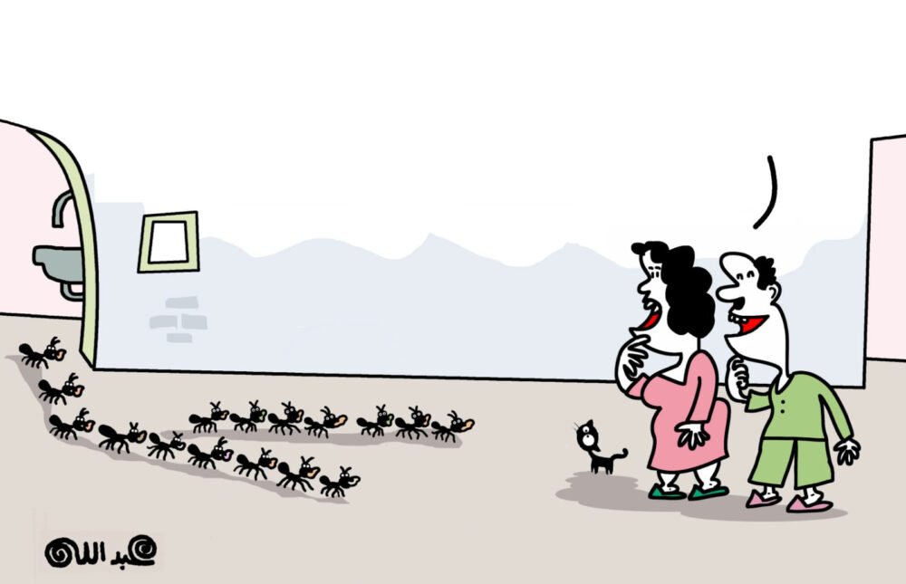 C’est le cas traité par le caricaturiste Abdallah sur le site d’AlMasry Al-Youm qui met en scène un couple. Le mari dit à son épouse : les fourmis ont mangé les kahks achetés à la pâtisserie et ils ont laissé les tiens. Une façon de la critiquer indirectement.