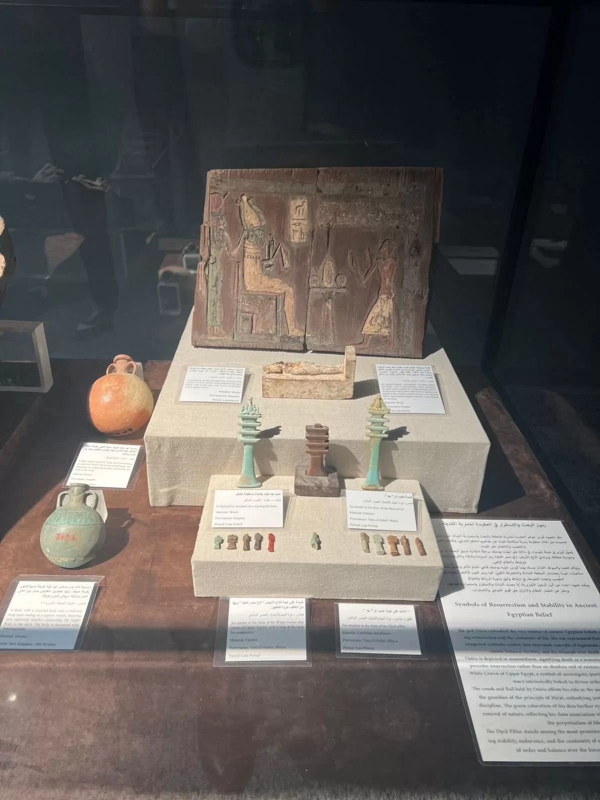 Parmi ces merveilles : un coffret de bois doré où trône Osiris, des scènes colorées représentant le dieu aux côtés d’Isis, une table d’offrandes, une collection de piliers “djed” et leurs amulettes protectrices, un sarcophage osiriaque contenant une momie et ses talismans funéraires. S’y ajoutent les scarabées sacrés, les amulettes du nœud d’Isis “le tyet”, celle de la couronne blanche symbolisant la légitimité et les origines du temps, des amulettes d’Horus, ainsi qu’un ensemble de vases et récipients rituels du Nouvel Empire et de l’époque tardive, liés à l’eau, à la fertilité et aux commencements de la vie. Enfin, une collection exceptionnelle de statues de la déesse Sekhmet, associée aux rites du Nouvel An, à la quête de protection et au rétablissement de l’harmonie universelle.