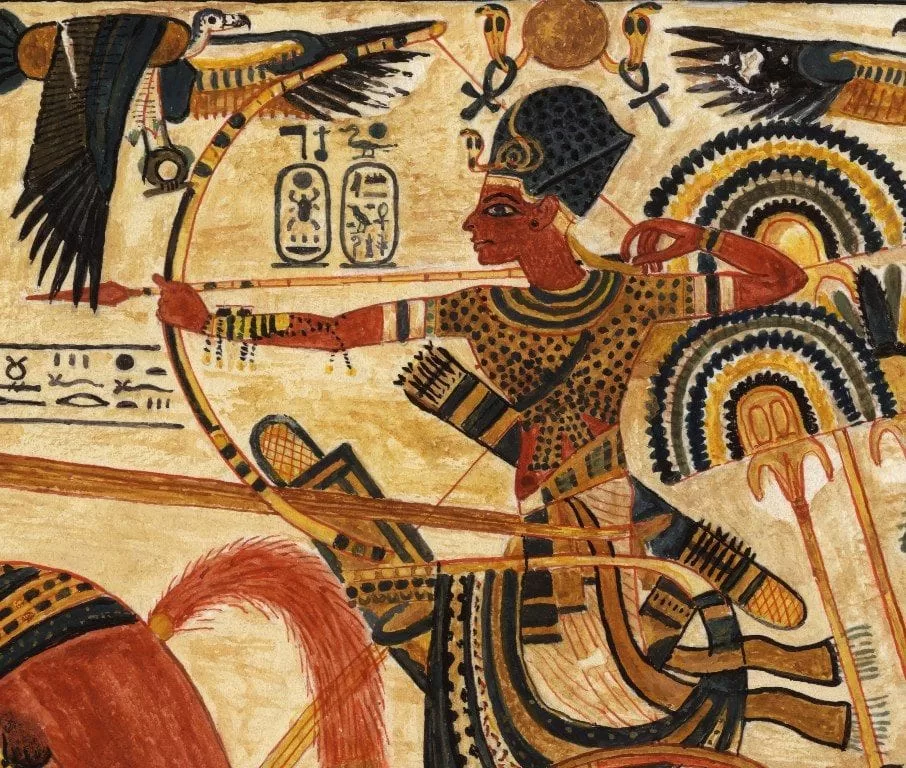 Face à eux, le pharaon incarne l’ordre, la stratégie et la puissance. Dans une scène spectaculaire, Toutânkhamon, debout sur son char, piétine ses adversaires. Au-dessus de lui plane la déesse protectrice Nekhbet, ailes déployées, tenant les symboles de l’éternité. A l’arrière, une armée disciplinée- chars, fantassins, archers- appuie son assaut. Même les chiens royaux participent à l’attaque, soulignant une organisation militaire complète. Les scènes de chasse ne sont pas moins éloquentes : gazelles, autruches et hyènes sont traquées, tandis que le roi affronte un lion. Une inscription précise : “Sa majesté