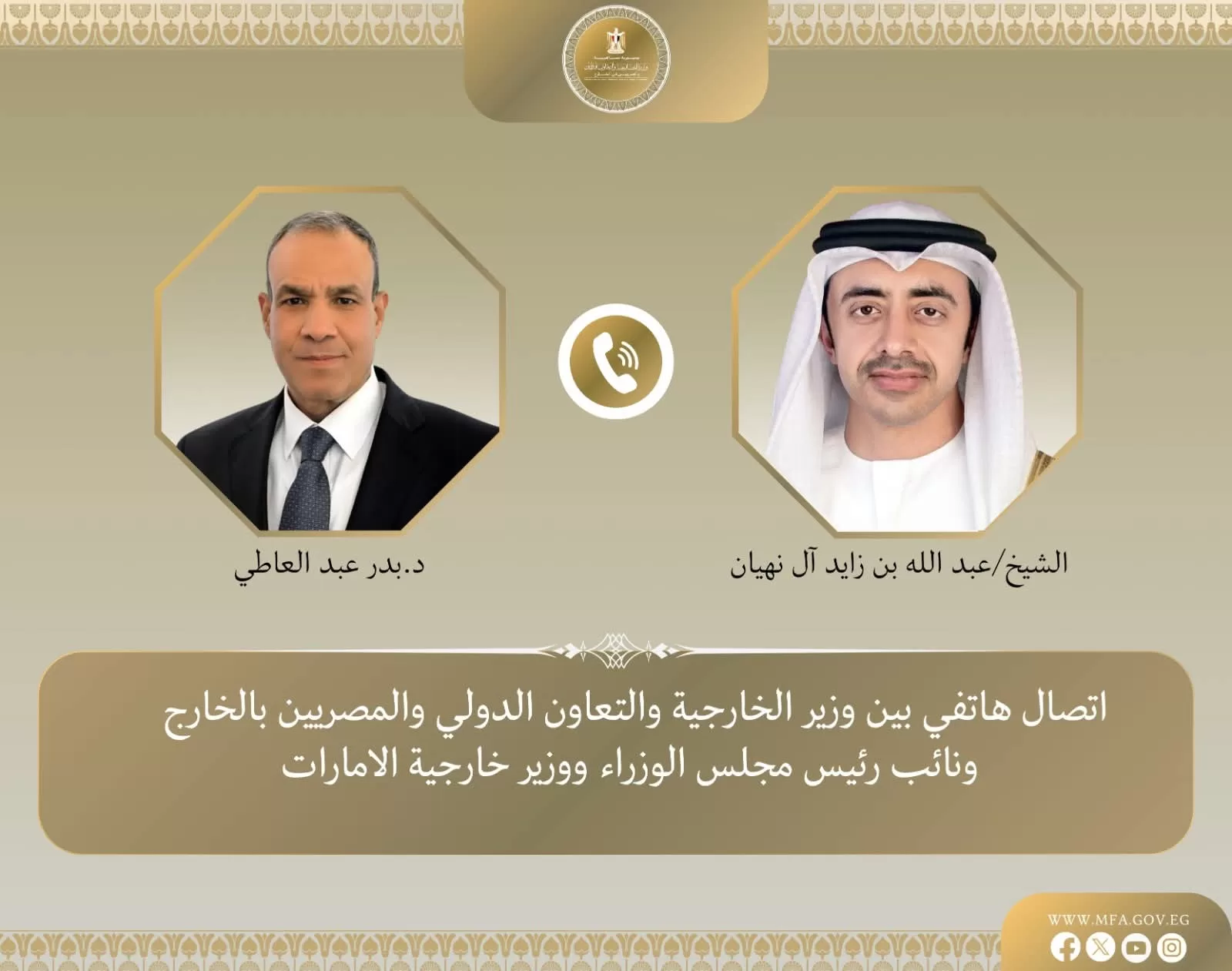 Le ministre égyptien des Affaires étrangères, Dr. Badr Abdel Aati, a eu un entretien téléphonique avec le ministre émirati, Cheikh Abdullah bin Zayed Al Nahyan, soulignant la solidité des relations bilatérales et l’importance de renforcer la coopération.