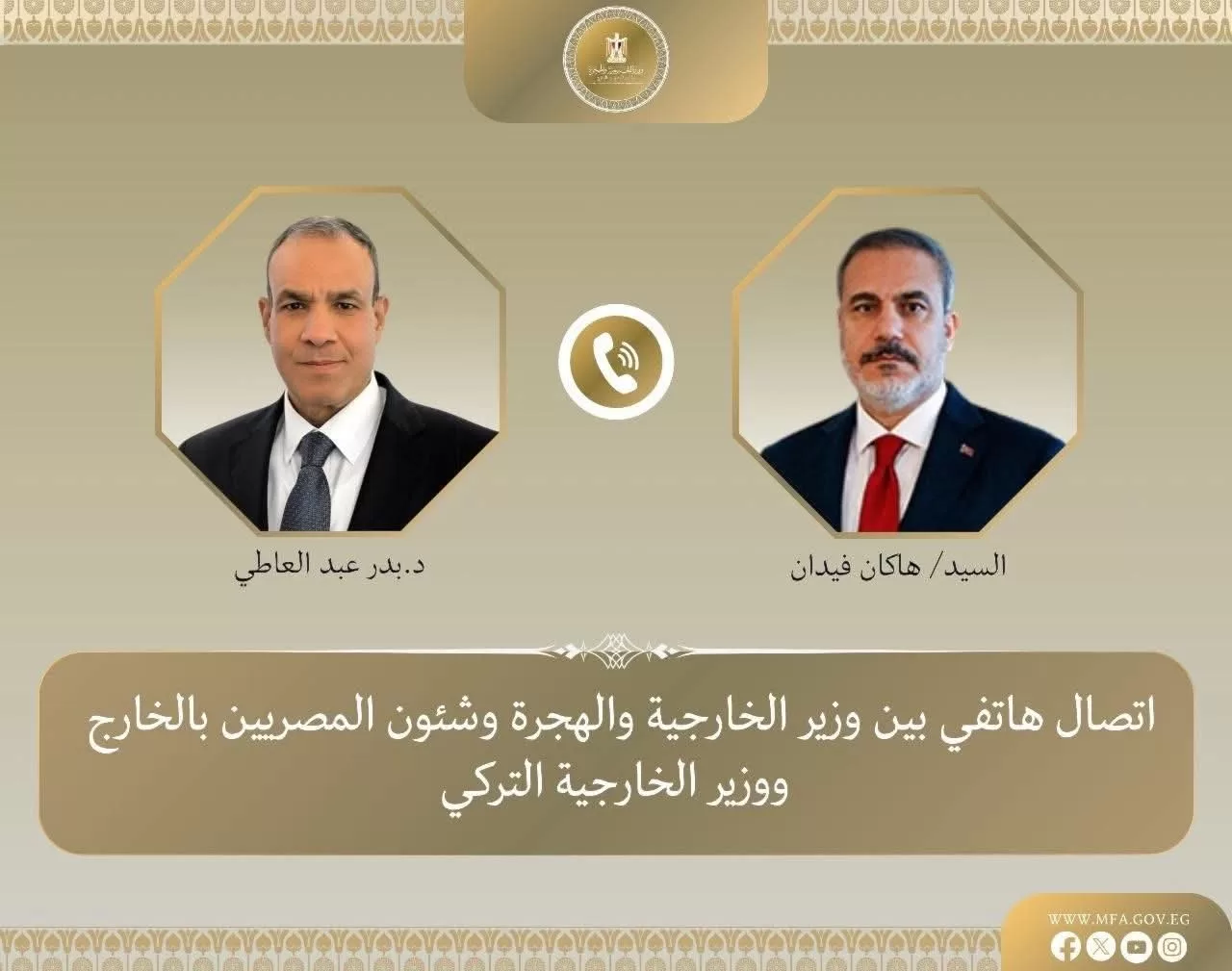 Un entretien téléphonique a eu lieu le mardi 13 janvier entre le Dr Badr Abdel-Aati, ministre des Affaires étrangères, de l’Émigration et des Affaires des Égyptiens à l’étranger, et M. Hakan Fidan, ministre des Affaires étrangères de la République de Turquie, afin d’examiner les développements des dossiers régionaux d’intérêt commun.