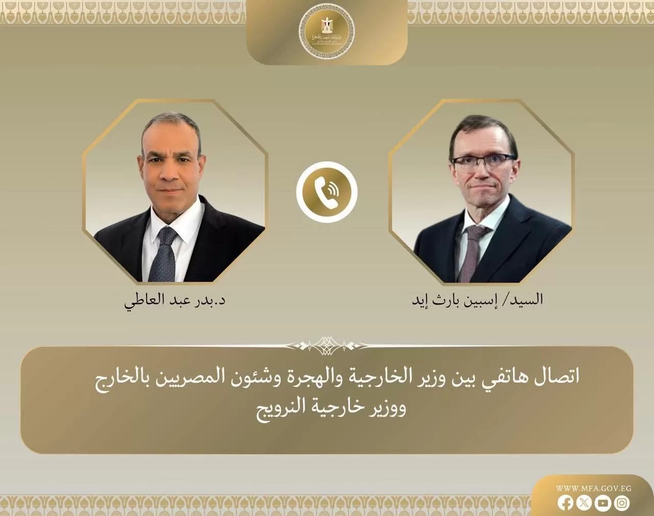 Dr Badr Abdel-Aati, ministre des Affaires étrangères, de l’Émigration et des Affaires des Égyptiens à l’étranger, s’est entretenu par téléphone, le samedi 27 décembre 2025, avec le ministre norvégien des Affaires étrangères, M. Espen Barth Eide, afin d’examiner les derniers développements régionaux.