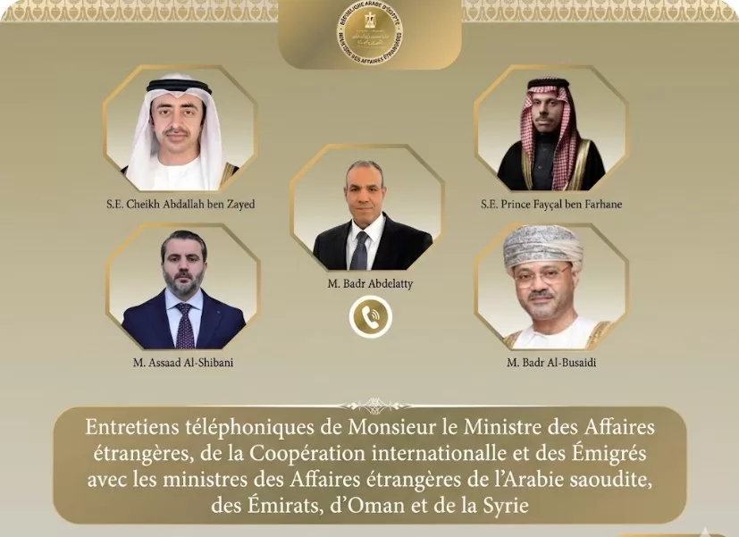 Dans le cadre du suivi des développements successifs dans la région, une série d’entretiens téléphoniques a eu lieu entre Dr Badr Abdelatty, ministre des Affaires étrangères, de la Coopération internationale et des Émigrés, et son altesse le prince Fayçal ben Farhane, ministre des Affaires étrangères du Royaume d’Arabie saoudite, son altesse le Cheikh Abdallah ben Zayed, vice-président du Conseil des ministres et ministre des Affaires étrangères de l’État des Émirats arabes unis, M. Badr ben Hamad Al-Busaidi, ministre des Affaires étrangères du Sultanat d’Oman, ainsi que M. Assaad al-Shibani , ministre des Affaires étrangères et des Expatriés de la République arabe syrienne.