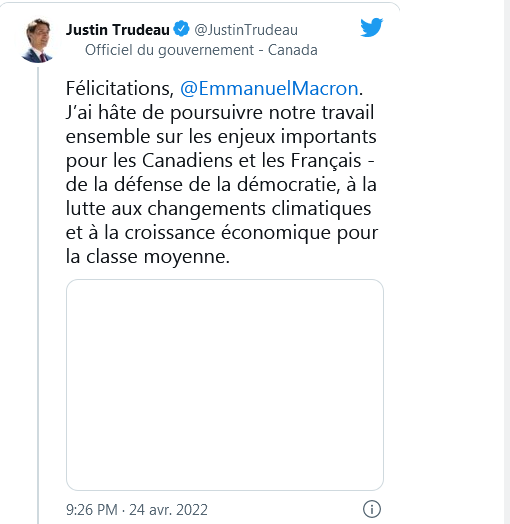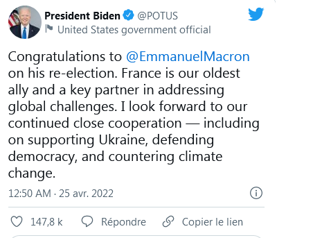 En dehors des frontières de l’Europe, le président américain Joe Biden a félicité son homologue français, affirmant que leurs deux pays continueraient à coopérer pour “défendre la démocratie”. “Je suis impatient de poursuivre notre étroite coopération – notamment pour soutenir l’Ukraine, défendre la démocratie et contrer le changement climatique”, a tweeté Joe Biden, qualifiant la France de “partenaireclé pour faire face aux défis mondiaux”. Le secrétaire d’Etat américain Antony Blinken a également félicité Emmanuel Macron, soulignant sur Twitter que Washington s’attendait à la poursuite d’une étroite coopération avec Paris : “Nous sommes impatients de poursuivre notre étroite coopération avec la France sur les défis mondiaux, en renforçant notre alliance et notre amitié longue et robuste”. Le Premier ministre canadien Justin Trudeau, a dit avoir “hâte de poursuivre le travail ensemble”. Le président chinois Xi Jinping a envoyé lundi un message à son homologue français Emmanuel Macron pour le “féliciter” de sa réélection, a indiqué la télévision chinoise CCTV. “Je souhaite continuer à travailler avec le président Macron pour défendre (…), comme depuis l’établissement de nos relations diplomatiques, les principes d’indépendance, de compréhension mutuelle, de clairvoyance et d’avantages mutuels”, a déclaré le président chinois.