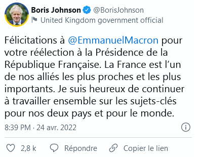 Le Premier ministre britannique Boris Johnson s’est dit “heureux de continuer à travailler” avec Emmanuel Macron. “Félicitations à Emmanuel Macron pour votre réélection à la Présidence de la République Française. La France est l’un de nos alliés les plus proches et les plus importants. Je suis heureux de continuer à travailler ensemble sur les sujets-clés pour nos deux pays et pour le monde”, a tweeté le dirigeant conservateur en français.