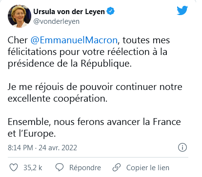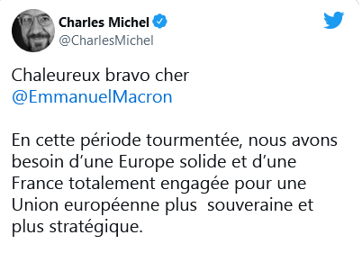 Le président du Conseil européen Charles Michel, qui représente les États membres, s’est félicité que l’Europe puisse “compter sur la France cinq ans de plus”. “En cette période tourmentée, nous avons besoin d’une Europe solide et d’une France totalement engagée pour une UE plus souveraine et plus stratégique”, a-t-il tweeté. “Je me réjouis de pouvoir continuer notre excellente coopération. Ensemble, nous ferons avancer la France et l’Europe”, a abondé la présidente de la Commission européenne, Ursula von der Leyen. Le Premier ministre italien, Mario Draghi, a salué “une magnifique nouvelle pour toute l’Europe”. Enthousiasme partagé par le dirigeant social-démocrate allemand Olaf Scholz : “Tes électeurs ont envoyé aujourd’hui un signal fort en faveur de l’Europe.