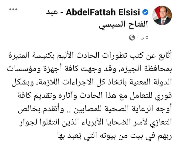 Le président a suivi de près l’évolution du tragique accident de l’église Abou Sefein dans le gouvernorat de Gizeh.