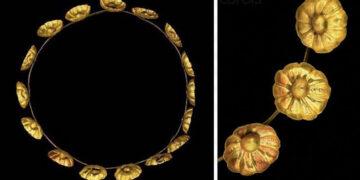 Il s’agit de cette couronne en or, appartenant à la reine Taousert, dernière souveraine de la 19ème dynastie. Cette pièce ravissante fait 104 grammes de poids, 17 cm de diamètre et de 0,4 cm diamètre de bandeau. Ce diadème renferme 16 fleurs de 3 cm de diamètre sur les pétales desquelles les cartouches de Séthi II … Continue reading La couronne d’or de Taousert