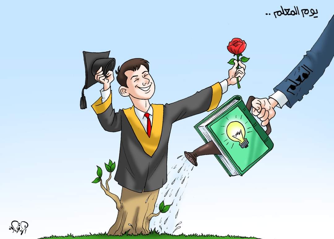 Le journal d’Al-Yom Al-Sabie, a célébré la Journée mondiale de l’enseignant, en présentant une caricature de l’artiste Ahmed Qaoud, à cette occasion, représentant l’enseignant comme la main qui irrigue- par les lumières du savoir- la plante qu’est l’étudiant, qui grandira pour lui offrir une fleur à sa Journée.
