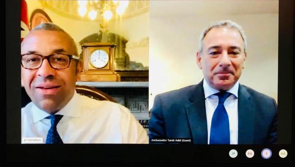 L’ambassadeur d’Egypte à Londres, S.E. Tarek Adel a examiné, lors d’une réunion par visioconférence avec le ministre d’Etat britannique pour le Moyen-Orient et l’Afrique du Nord, James Cleverly, les développements liés aux répercussions de la propagation du Covid-19 sur le trafic aérien à travers le monde et les restrictions imposées sur les passagers de certains pays, apprend-on de l’agence de presse du Moyen-Orient (MENA), citant la page officielle du ministère des Affaires étrangères.