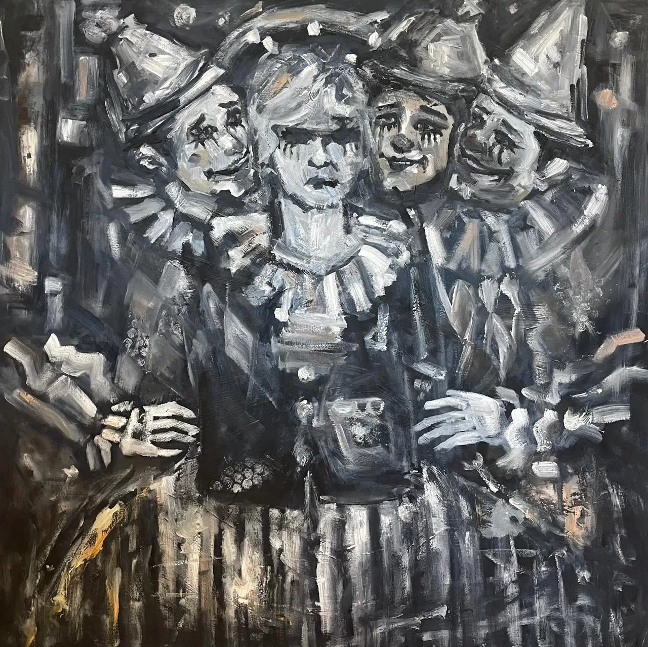De l’animation, Ingy Mahmoud a conservé un sens aigu du mouvement. Ses toiles ne connaissent pas le repos. Elles vibrent d’une tension sourde, d’un dialogue intérieur incessant. Chaque visage semble suspendu à une parole qui ne vient pas, à un effondrement imminent, ou à un sourire qui tremble au bord des lèvres. Ce qu’elle peint, ce n’est pas le clown tel que nous le connaissons, mais une multiplicité d’états : demi-joie, demi-rire, demi-victoire. Tantôt éclatant de couleurs, tantôt réduit à l’austérité du noir et blanc, son personnage se dédouble, se contredit, oscille entre sarcasme et désespoir. Il devient moins un être qu’un miroir des fractures intimes.