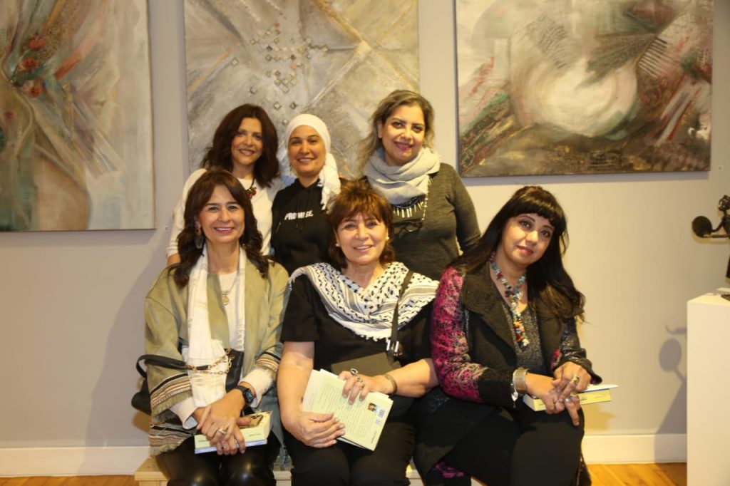 La conversation a commencé à propos du roman (Le cœur a un dernier ancrage). Sur le mur de la galerie se trouvaient six artistes féminines représentant des femmes capables de s’accomplir dans plus d’un domaine. La première artiste est Cherine Al-Khalili, la propriétaire de la galerie. Elle a quitté le monde bancaire, malgré ses succès, mais elle voulait avancer vers la réalisation de son rêve et du rêve des filles de sa génération, et l’idée de l’exposition est de mettre en valeur les héroïnes de la vie dont rien n’empêchent de réaliser le rêve. Elle a dessiné une fille ou une femme qui regarde l’avenir, qu’elle voit toujours comme plus beau, dans lequel les espoirs et les rêves deviennent réalité, et elle apparaît toujours de dos comme si elle était la seule à le voir, avec un œil perspicace.