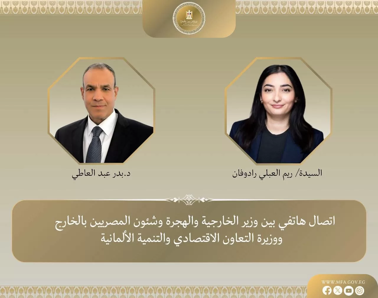 Le ministre des Affaires étrangères,de l’Immigration et des Affaires des Égyptiens à l’étranger,Dr Badr Abdel-Aati, a reçu un appel téléphonique de la ministre allemande de la Coopération économique et du Développement, Reem Alabali-Radovan