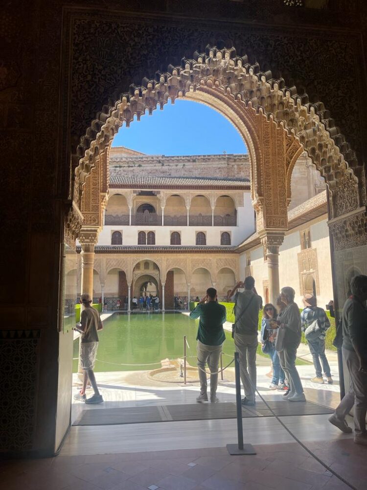 Le palais est rempli de cours, de fontaines pittoresques et des chefs-d’œuvre qui en disent tout, laissant inutiles d’en parler ou de les décrire. Il y a aussi une cour contenant 12 lions appelée la cour des lions, en plus de la “Salle des deux Sœurs” et celle de la cour du basilic. De nombreuses légendes et contes ont été racontés sur le palais d’Al-Hamraa, dont le plus célèbre est que sur la porte de la “Justice” sont gravées une main et une clé.