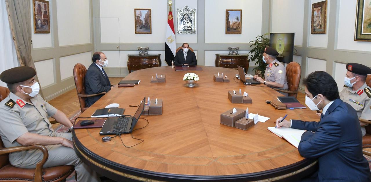 Le Président Abdel Fattah Al Sissi a tenu une réunion avec le conseiller du président pour la planification urbaine, Amir Sayed Ahmad, le président du Génie militaire, Ihab Al Far, le chef du bureau de consultations du Génie, Achraf Al Arabi et le vice président du Génie chargé des projets routiers, Abdel Aziz Al Feqqi.