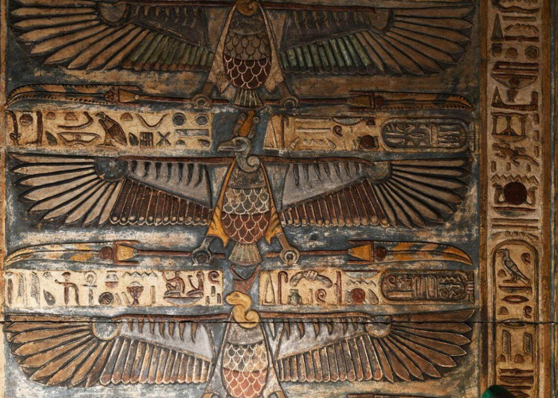« Les travaux de nettoyage ont donné la chance aux inscriptions et aux gravures sur les murs et le plafond de réapparaître. Ces inscriptions se trouvent au-dessus de l’entrée à 14 mètres de hauteur. Elles renferment les dessins de 46 aigles alignés dans deux rangs, dont 24 portent la tête d’un aigle représentant Nekhbet, déesse protectrice de la Haute Égypte, tandis que les 22 autres représentent Ouadjet, déesse cobra qui est la protectrice de la Basse Égypte. », a expliqué Dr Moustafa Waziri, SG du Conseil suprême des Antiquités. Et d’ajouter que les travaux de l’égyptologue français Serge Sauneron publiés entre 1963 et 1975 étaient incomplets.