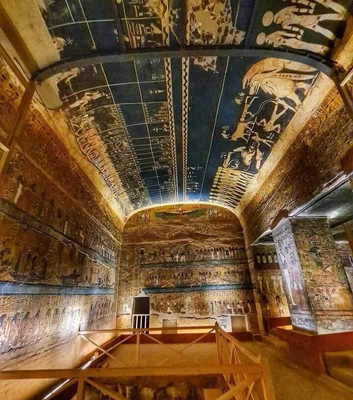 Dans la vallée des Rois, dans la nécropole thébaine sur la rive ouest du Nil à Louxor, se trouve le somptueux tombeau du père de Ramsès II, Séthi 1er. Ce tombeau est connu par ses décorations et les couleurs sur ses parois qui lui ont valu d’être qualifié d’unique et sans précédent. C’est grâce à l’égyptologue italien Giovanni Battista Belzoni que ce tombeau fut découvert en 1817. Il s’agit du plus grand tombeau de la vallée. Long de cent mètres, il contient des reliefs très bien conservés dans chacune de ses onze chambres et pièces latérales. Le plafond est peint en bleu nuit. Une enfilade de vautours aux ailes déployées s’étirent sur toute la largeur du couloir. Ce sont des représentations de la déesse Nekhbet qui a, en charge, la garde de l’entrée du tombeau. Des colonnes d’hiéroglyphes s’alignent sur les parois latérales.