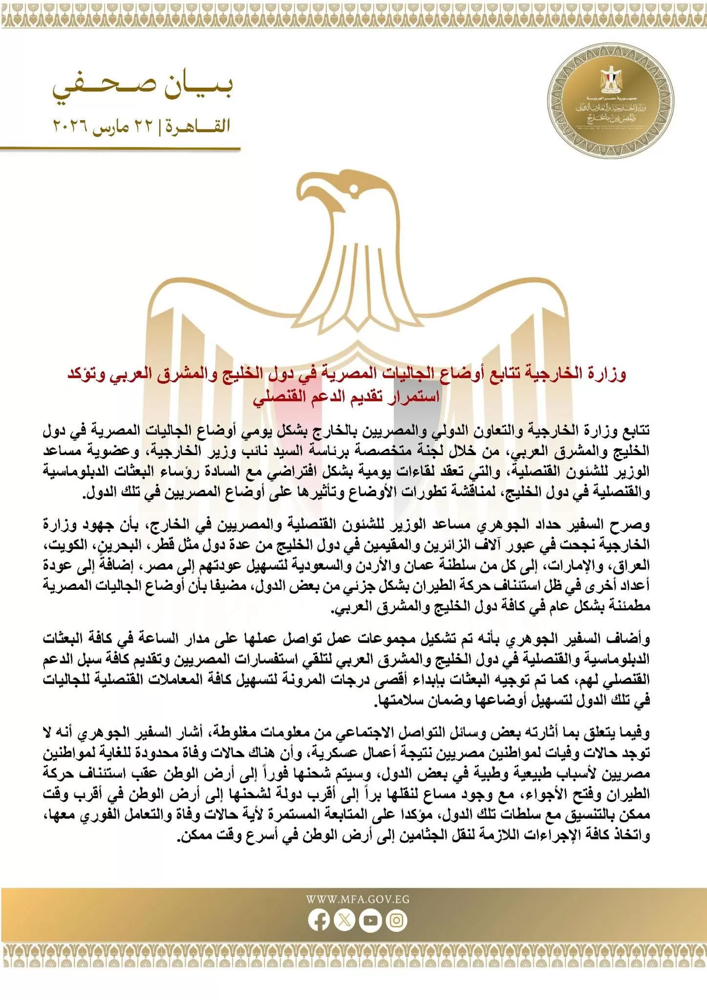 Le ministère égyptien des Affaires étrangères et de la Coopération internationale, chargé des Égyptiens à l’étranger, suit quotidiennement la situation des communautés égyptiennes dans les pays du Golfe et du Machrek à travers une cellule dédiée en coordination avec les missions diplomatiques.