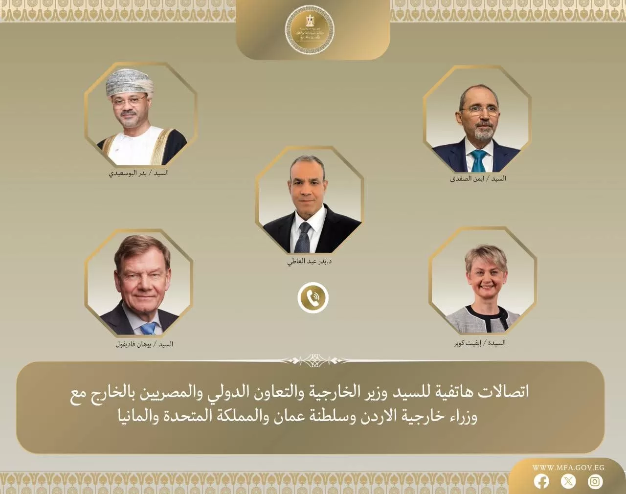 Le ministre des Affaires étrangères, de la Coopération internationale et des Égyptiens à l’étranger,Dr Badr Abdel-Aati s’est entretenu par téléphone avec M. Ayman Safadi, vice-premier ministre et ministre des Affaires étrangères de Jordanie, M. Badr Albusaidi, ministre des Affaires étrangères d’Oman, M. Johann Wadephul, ministre des Affaires étrangères d’Allemagne, ainsi que Mme Yvette Cooper, ministre des Affaires étrangères du Royaume-Uni.