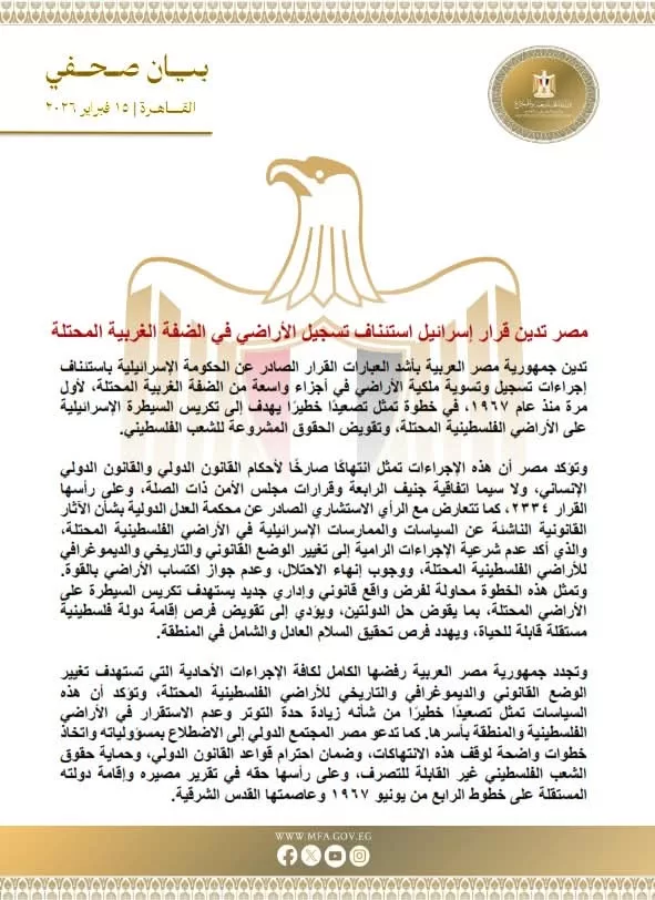 La République arabe d’Égypte condamne avec la plus grande fermeté la décision émanant du gouvernement israélien de reprendre les procédures d’enregistrement et de régularisation foncière sur de vastes zones de la Cisjordanie occupée, pour la première fois depuis 1967. Cette mesure constitue une escalade dangereuse visant à consacrer le contrôle israélien sur les territoires palestiniens occupés et à saper les droits légitimes du peuple palestinien.