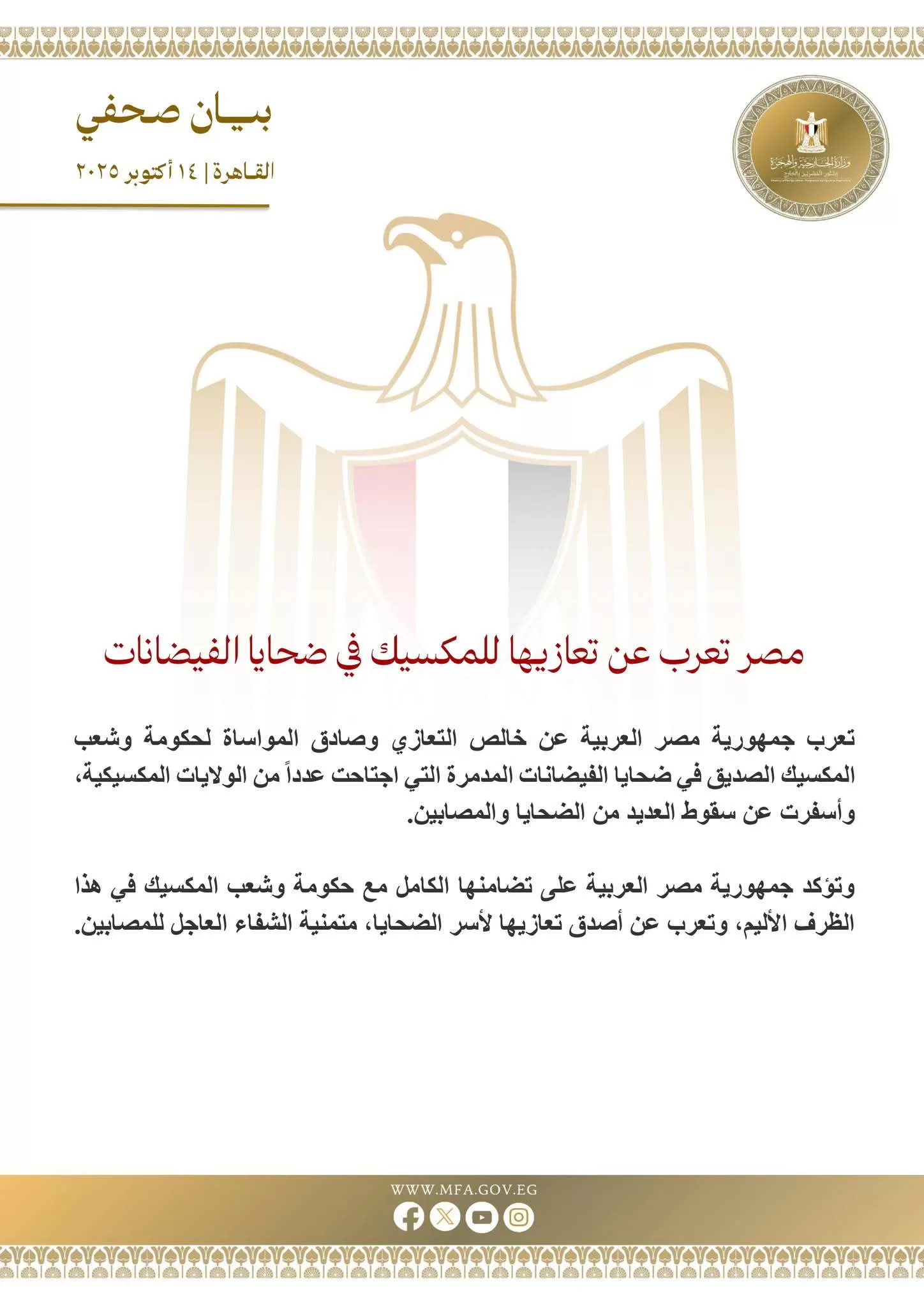 La République arabe d’Égypte a adressé ses plus sincères condoléances et sa profonde compassion au gouvernement et au peuple mexicains, à la suite des violentes inondations qui ont frappé plusieurs États du Mexique, provoquant de lourdes pertes humaines et d’importants dégâts matériels.