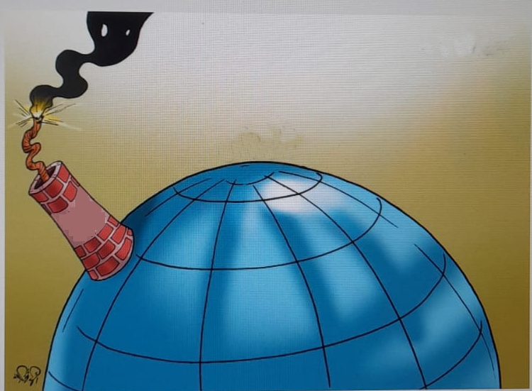 Une caricature publiée par Al-Youm Al-Sabie, ayant pour titre «Le changement climatique» illustre la Terre comme une bouilloire de laquelle se dégagent des gaz à effet de serre. En fait, les gaz à effets de serre sont la cause principale du réchauffement climatique qui menace la planète. Les émissions industrielles et celles causées par les combustibles sont pointées du doigt. Selon les études mondiales, entre 2005 et 2019, on a observé une hausse de 24 % des émissions mondiales de GES ; la plupart des augmentations ont été observées dans les pays en développement. Les GES sont le premier responsable du réchauffement et du changement climatique. Au vu de l’urgence climatique que nous vivons actuellement, ces gaz sont perçus comme la menace à éradiquer.