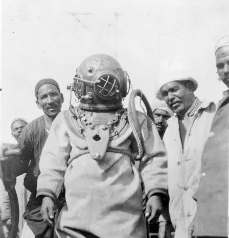 Une photo d’ouvriers égyptiens se préparant à couler les fondations en béton du pont Qasr al-Nil au fond du Nil en 1932.