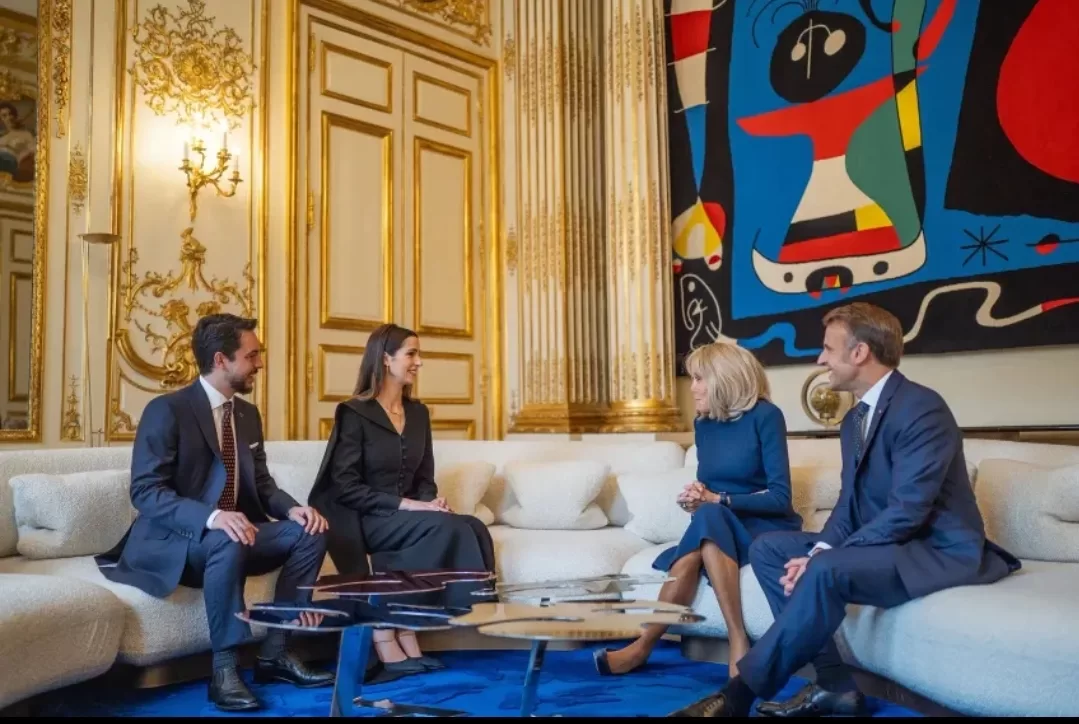 Une visite qui tombe à pic… pour oublier le fiasco politique dans laquelle la France est plongée. Le mercredi 8 octobre, Emmanuel et Brigitte Macron ont reçu à l’Elysée le prince héritier Hussein de Jordanie et son épouse Rajwa, d’une grande élégance dans une longue robe noire. Le prince et la princesse Hussein ben Abdallah et Rajwa Al Hussein – de leurs noms complets – ont été accueillis dans le cadre d’un déjeuner de travail, pour ce qui constitue leur première visite officielle en France, selon Paris Match.