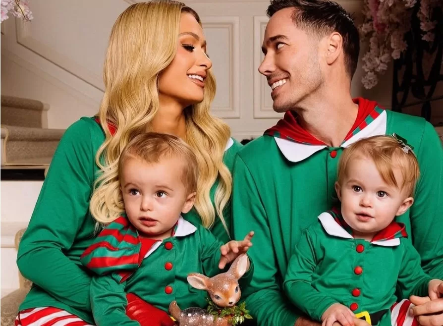 Paris Hilton, son mari Carter Reum, leur cadette London et leur aîné Phoenix ont pour leur part joué les lutins le temps du réveillon. Pantalons rouges à rayures, pulls verts clinquants et chaussons confortables, la petite famille a fait quelques photos au pied de leur grand escalier, accompagnée de leurs deux chiens.