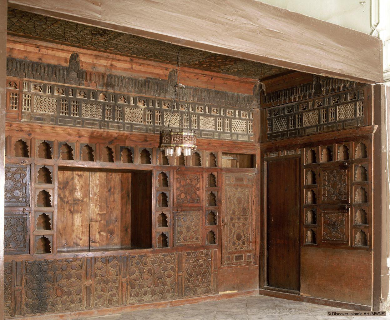 Cette photo illustre une décoration en bois. Cette pièce date du 6ème siècle de l’Hégire et se trouve actuellement au musée de l’art islamique au Caire. Il mesure 340 cm de hauteur et 465 cm de largeur et appartient à la période ottomane. Cette pièce faisait normalement partie du Kuttab quiétait un lieu pour l’apprentissage du Coran, de la langue arabe et sagrammaire.
