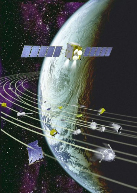 Le lancement de la fusée soviétique R-7 Semiorka le 4 octobre 1957, plaçant en orbite Spoutnik, cette petite boule de 84 kilogrammes constituant le premier satellite artificiel, a marqué le début de la conquête spatiale, mais également celui de la pollution de l’espace. En effet, sur la même orbite que ce satellite, mais derrière lui, se trouvait le dernier étage de la fusée (assemblage de réservoirs et moteurs de 6,5 tonnes), devenu inutile dès la séparation du satellite et dangereux, tant par les risques de collision avec Spoutnik que par le risque d’explosion engendré par les ergols résiduels. Sur cette même orbite se trouvait également une petite coiffe conique (d’une centaine de kilogrammes), protégeant Spoutnik pendant la traversée de l’atmosphère et larguée devant le satellite une fois celui-ci en Argot orbite. Spoutnik lui-même a émis son fameux bip-bip pendant vingt et un jours, période pendant laquelle il était donc fonctionnel. Ensuite, il s’est tu, faute de batteries, jusqu’à sa rentrée dans l’atmosphère qui a eu lieu quatrevingt-douze jours après son lancement. Devenu non opérationnel, Spoutnik a donc luimême été un débris orbital pendant les trois quarts de sa vie, évoluant de façon incontrôlée et incontrôlable ; tout au plus pouvait-on suivre sa trajectoire. Cet exemple illustre bien l’origine principale de débris orbitaux, car la situation a peu évolué depuis. On continue ainsi à lancer des satellites en abandonnant les étages supérieurs des fusées en orbite. Puis, après leur vie active, les satellites sont généralement laissés sur place pour de nombreuses années, si ce n’est pour toujours