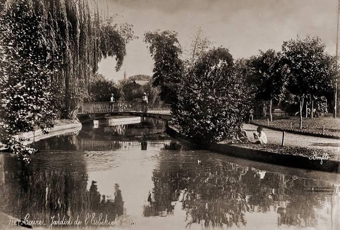 A la fin du XIVème siècle, le sultan Qaïtbaï offrit à son chef de l’armée, Seif Eddine Ben Azbak, une parcelle de terre à proximité du lac «Batn el-Bakara», sur laquelle il fit construire une maison et une promenade qui portèrent son nom «Azbakieh» En 1495, Azbakieh devenait un grand quartier au centre-ville du Caire. A l’époque ottomane, Radwan Katokhda fit construire dans ce quartier un somptueux palais du côté Est de ce lac, baptisé «El-Attaba el-Zarka». C’est à partir de la place Azbakieh que la population du Caire manifesta en 1805 pour faire allégeance à Mohamed Ali comme gouverneur d’Egypte. Mais c’est en effet le Khédive Ismaïl Pacha qui est le bâtisseur de l’Azbakieh moderne. L’endroit était abandonné jusqu’au retour d’Ismaïl de Paris en 1867 où il a été ébloui par son style urbain, ses rues et ses parcs. Ismaïl Pacha donna des instructions en 1869 pour faire de l’Azbakieh un quartier moderne. Il a alors fait combler le lac, qui était situé au centre de la place Azbakieh, et fit construire à l’emplacement par un architecte français le merveilleux parc d’Azbakieh qui était d’une superficie de 18 feddans. Le parc était entouré de grilles de fer et de béton. Quatre portes avaient été installées dans ses quatre flancs. Au début, Ismaïl y fit construire des promenades et des jardins à la parisienne où il était permis aux passants de se promener le soir seulement en écoutant des groupes de musique occidentale jouer toute la nuit. Les jardins étaient très fréquentés grâce aux activités théâtrales et musicales par des communautés étrangères notamment française. La région d’Azbakieh comprenait à l’époque un grand nombre d’hôtels de luxe dont Shepherd, Continental, Windsor, Eden Palace ainsi que l’Opéra khédivial. Considéré comme le monument le plus emblématique du règne d’Ismaïl Pacha, l’Opéra fut construit par l’architecte Avoskani, à la place du vieux palais du prince Azbak. Le Théâtre de la Comédie Française est le premier théâtre construit dans le jardin situé au sud de la place Azbakieh. Le théâtre était construit en bois et richement embelli de l’intérieur avec de très belles toiles. L’entrée était faite de deux grandes portes, une à gauche pour le Khédive et une à droite pour les dames.