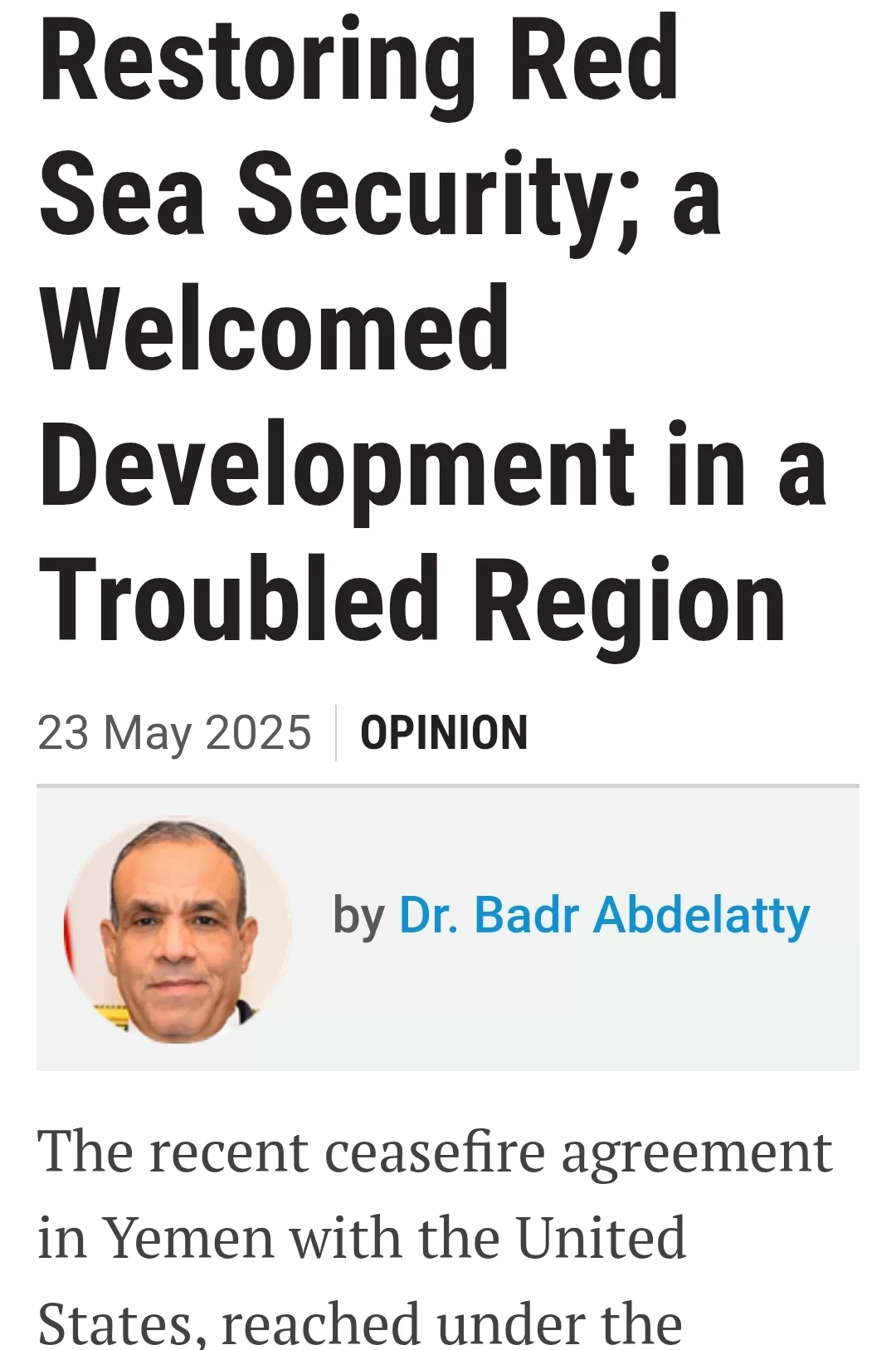 Dans son article, Dr Abdel-Aati réaffirme l’engagement constant de l’Égypte à œuvrer pour la paix et la stabilité régionales. Il insiste sur la nécessité d’aborder les causes profondes des conflits dans la région afin d’assurer une stabilité durable dans la zone de la mer Rouge.