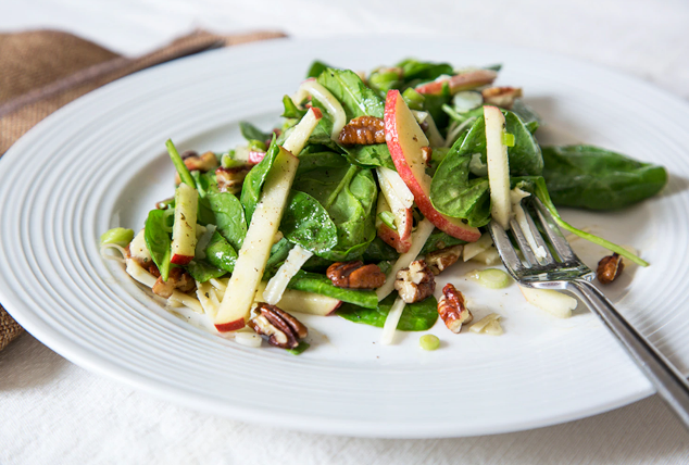 • 4 tasses épinards lavés • 1 pomme • 4 oignons verts • 1/2 tasse pacane ou plus, au goût • 75 g fromage cheddar fort râpé