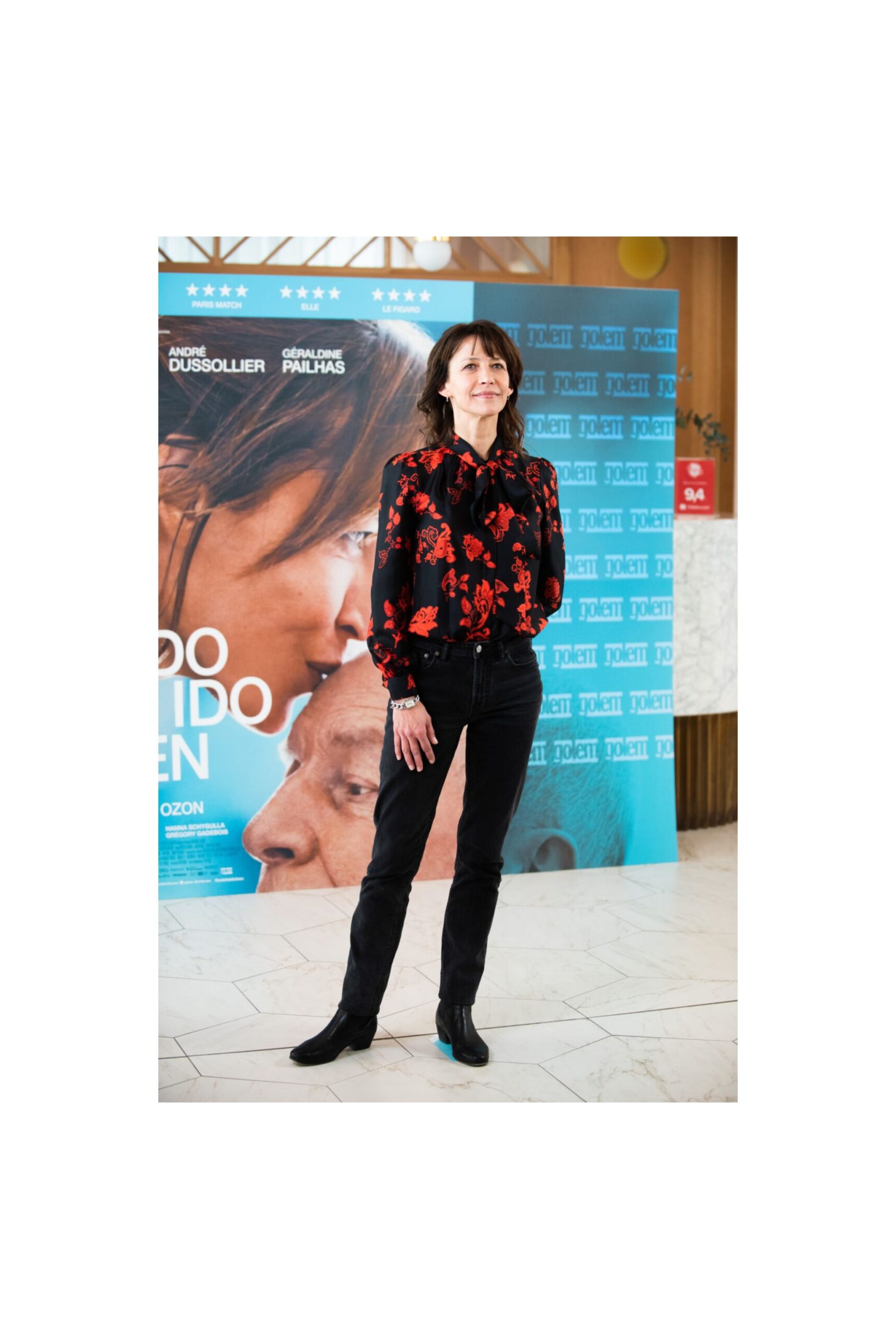 Chemise fleurie, jean et bottes de cowgirl ? Le mélange paraît surprenant et pourtant c’est le combo gagnant de Sophie Marceau ! À Madrid avec François Ozon pour la présentation de leur dernier film, l’actrice a une fois de plus brillé par son style, selon www. voici.fr. En pleine promotion du f ilm Tout s’est bien passé avec André Dussolier, Sophie Marceau rayonne. De passage à Madrid pour accompagner François Ozon, l’actrice beaucoup de caractère et d’originalité au look. Et pour structurer l’aspect fluide de la chemise en soie, l’actrice de La Boum choisit plutôt un jean taille haute qui souligne la taille.Détail supplémentaire : l’impression fleurie rouge et noire apporte une valeur ajoutée à cette association très simple et vraiment efficace. française de 55 ans a fait des choix stylistiques audacieux. L’esprit de sa tenue : élégante et confortable avant tout. Sophie Marceau a misé sur l’association de deux pièces parfaites en duo : une chemise en soie à col lavallière et un jean noir droit. Elle ajoute une paire de bottes noires à l’allure western et le tour est joué. Le résultat : une tenue aussi décontractée que sophistiquée qui correspond parfaitement à la personnalité rafraîchissante de Sophie Marceau. Qui a dit que le chemisier habillé devait forcément être porté avec un tailleur ? Au contraire, associer une pièce élégante comme la chemise lavallière avec un jean donne Grâce aux motifs de couleur, le look comme le teint de Sophie Marceau sont ravivés. C’est une astuce facile à appliquer au quotidien pour changer des silhouettes complètement noires. Avec une touche de couleur vive, pas besoin d’en faire des tonnes côté maquillage et bijoux.