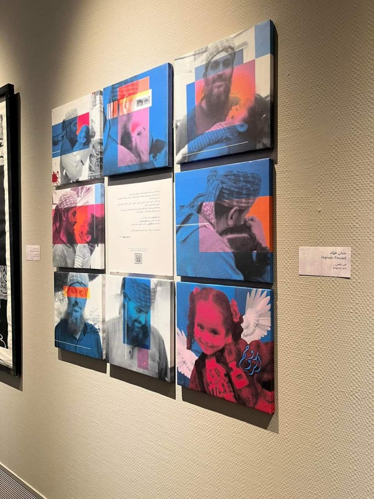 “Je n’ai pas été témoin de la tristesse d’Abou Diaa comme n’importe quel autre spectateur, ni n’ai pleuré comme toute autre personne qui pleure. J’ai ressenti de la douleur lorsque j’ai lu entre les lignes de ses émotions et que j’ai contemplé ses mouvements, ses regards et ses rires. J’ai reçu de lui quelque chose qu’il n’a pas révélé.” C’est par ces mots que Hanan Fouad, la créatrice de l’œuvre, a décrit l’idée de son projet et le choix de l’histoire du grand-père. Et la petite-fille martyre et son attachement à elle parce qu’elle a été présentée de manière artistique et avec une vision particulière. Hanan Fouad, professeur à la Faculté des Beaux-Arts, Département de Graphiques, qui a participé aux œuvres d’art de l’exposition, dit que lorsqu’elle a vu la vidéo de Khaled Nabhan, l’homme palestinien, grand-père de la martyre « Reem », l’une des martyrs des événements de Gaza, qui s’est répandue sur les réseaux sociaux, ce n’était pas seulement une vidéo influente pour elle, mais elle avait de nombreuses significations et a laissé un grand impact sur elle, en raison de la façon dont le grand-père a géré la situation et de ses émotions. Tous ces sentiments, elle les a contemplés attentivement et en privé.